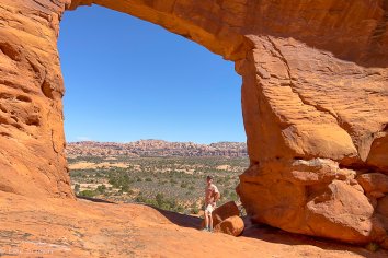 Ziemlich eindrucksvoll, der Arch. Andreas klettert bis nach oben und durch die neue Perspektive, die er von dort hat, wird auch sofort klar, woher der Arch seinen Namen hat: wie durch einen Bilderrahmen schaut man auf die Landschaft dahinter: