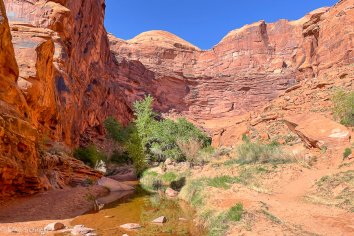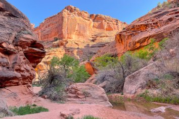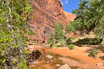 Der Weg zum Hunter Arch ist dann aber total schön: Er verläuft durch das Hunter Valley, wo der Kontrast des vielen Grün mit den roten Steinen einfach nur toll ist: