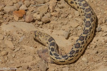 Als wir schon wieder auf dem Rückweg sind, bemerke ich aus dem Augenwinkel auf einmal eine schnelle Bewegung am Boden und tatsächlich schlängelt sich doch da eine Schlange am Weg entlang. Wir sind uns nicht sicher, ob diese Art gefährlich ist und gehen deshalb lieber einen kleinen Umweg, um ihr nicht zu nahe zu kommen. Später erklärt uns ein Ranger allerdings, dass es sich um eine harmlose Bull Snake gehandelt hat.