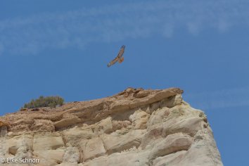 Zwischendurch fühlt sich ein Falke offenbar durch uns gestört — womöglich sind wir in der Nähe seines Nestes — und fliegt immer wieder laut kreischend dicht über unseren Köpfen hinweg. Fast eine Viertelstunde lang geht das so, bis wir anscheinend wieder aus seinem Gefahrenbereich verschwunden sind.