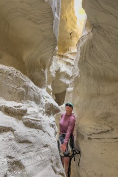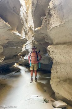 Irgendwann rücken die Canyonwände immer näher zusammen und es wird enger und enger. Wir müssen seitlich laufen, den Rucksack über dem Kopf tragen und den Bauch einziehen, um überhaupt irgendwie langsam und mühsam voranzukommen. Immer wenn wir eine Engstelle überwunden haben und wieder etwas Luft bekommen, denken wir, jetzt haben wir es geschafft — nur um dann an der nächsten Biegung mit der nächsten Engstelle konfrontiert zu werden.
