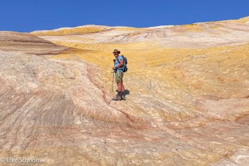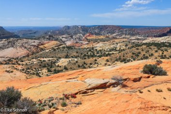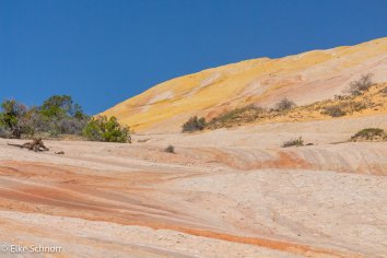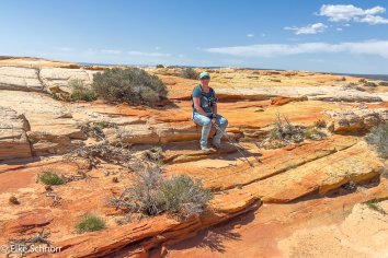 Und der Weg hinauf auf die höchste Stelle des Yellow Rock lohnt auf jeden Fall. Uns erwartet ein 360°-Panorama, was seinesgleichen sucht und in Verbindung mit dem heute fast stahlblauen Himmel einen absolut irren Kontrast bildet.