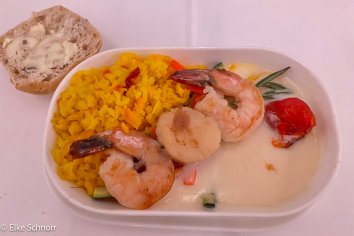Unser Flug mit Edelweiß startet leicht verspätet, dafür werden wir unterwegs von einem äußerst zuvorkommenden Personal verwöhnt. Das Essen ist ausgezeichnet, allerdings fühle ich mich uralt, da mich der Steward ständig mit „Gnädige Frau“ anspricht