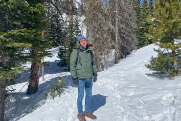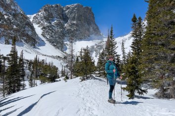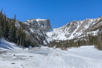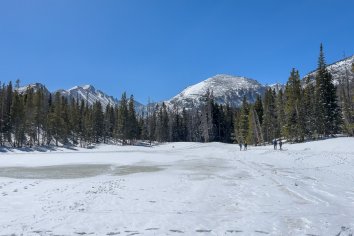 Der Parkplatz am Bear Lake ist noch erstaunlich leer — aber uns soll es recht sein. Wir schnüren unsere Wanderschuhe, packen vorsorglich die Spikes ein und brechen dann auf zu einer Winterwanderung durch die verschneite Landschaft.