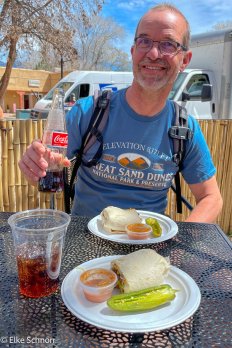Als kleinen Mittagssnack teilen wir uns einen Burrito — man beachte: Andreas trinkt Cola