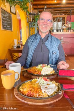 Stattdessen telefonieren wir eine Runde mit zu Hause und gehen um 7:30 Uhr zum Frühstücken in’s Palacio Café. Hier genehmigen wir uns in Aussicht auf die ordentliche Wanderung, die für heute geplant ist, ein ebenso ordentliches Frühstück in Form von Huevos Rancheros — sehr lecker und sehr reichlich: