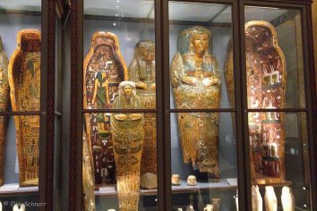 Wir haben leider nicht genug Zeit, uns alle Ausstellungen im Haus anzuschauen und beschränken uns deshalb auf die Gemäldegalerie und auf die ägyptisch-orientalische Sammlung. Hier gibt es vor allem Sarkophage, Mumien und Grabinventar wie Schmuck und Gefäße zu sehen, die teilweise bis in die Frühzeit Ägyptens (5000 v.Chr.) zurück gehen. Aber auch Statuen, Skulpturen und Reliefs finden sich in der Antikensammlung.
