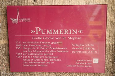 Hier oben schauen wir uns auch die „Pummerin“ an — eine 21 Tonnen schwere Glocke, die 1683 nach der zweiten Türkenbelagerung aus dem Erz der erbeuteten Kanonen gegossen wurde.